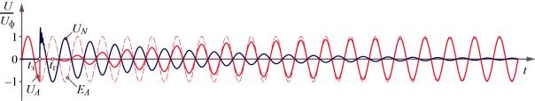 На рис. 5,б и 5,в показаны восстанавливающиеся напряжения для случаев δа = 0,02 (сети с очень высокой добротностью) и δа = 0,05 (типичное значение). При δа = 0,02 напряжение восстанавливается до максимального значения 1,56Uфm, при δа = 0,05 – до 1,25Uфm.