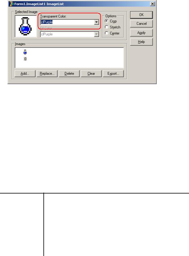Обратите внимание, что для изображений помещенных в компонент TImageList не нужно сначала выводить маску спрайта, а затем сам спрайт. Достаточно указать «прозрачный» цвет при загрузке изображения в список (для bmp файлов, для ico файлов этого делать не нужно, т.к. информация о прозрачных областях хранится в самом файле) (рисунок 7).