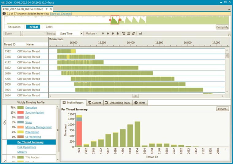 Профилировщик Visual Studio, в режимах Concurrency (Данные конфликтов ресурсов (параллелизм)) и Concurrency Visualizer (Визуализатор параллелизма), использует события ETW для мониторинга производительности многопоточных приложений и предоставляет отчет с несколькими весьма полезными представлениями, упрощающими узкие места, отрицательно сказывающиеся на масштабируемости и производительности. Он имеет два режима работы.