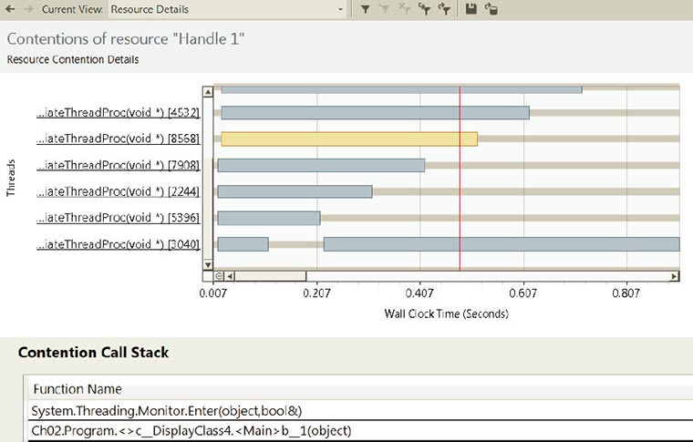 В режиме Concurrency (Данные конфликтов ресурсов (параллелизм)) выявляются ресурсы, такие как управляемые блокировки, на которых потоки выполнения в приложении останавливаются в ожидании их освобождения. Первая часть отчета описывает сами ресурсы и потоки выполнения, которые были заблокированы на них - она поможет найти и устранить недостатки, мешающие масштабированию: