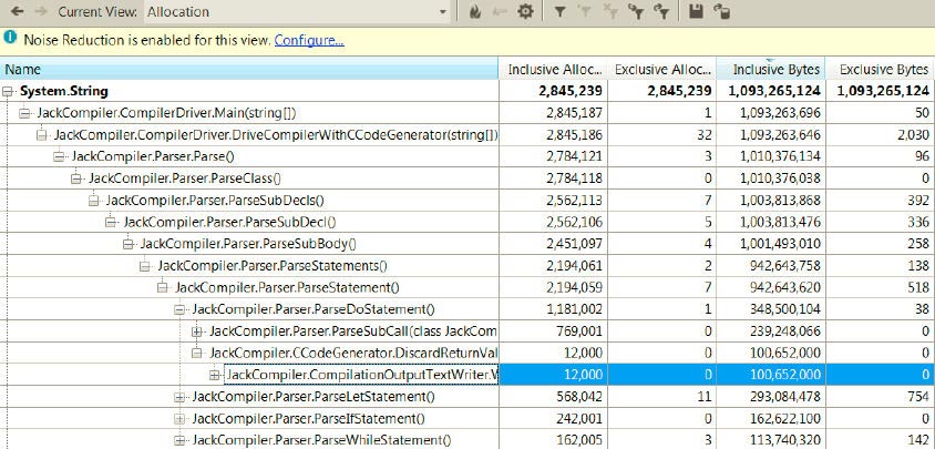 Но самая интересная информация содержится в представлении Allocation (Выделение), показывающем, какие ветви в стеке вызовов выделили памяти больше всего: