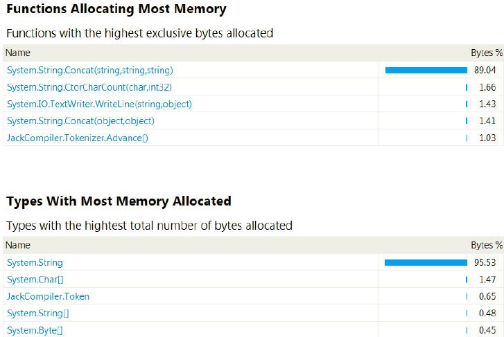 Для того, чтобы запустить профилировщик выделения памяти, в мастере настройки профилировщика производительности нужно выбрать радиокнопку .NET memory allocation (Выделение памяти .NET). В конце сеанса профилирования, в представлении Summary (Сводка), будут показаны функции, выделившие памяти больше всего: