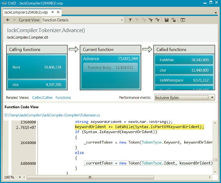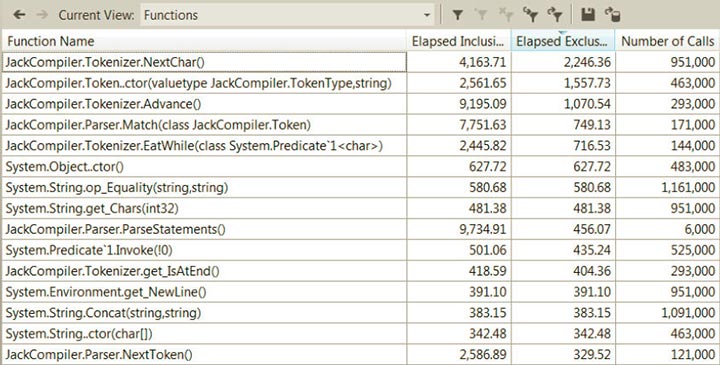 На рисунке ниже показано представление Functions, где доступны включительное и исключительное время, измеренные в миллисекундах, а также счетчики вызовов функций: