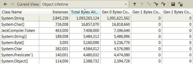Представление Object Lifetime (Жизненный цикл объектов), сообщает, в каком поколении объекты были утилизированы. Это представление поможет увидеть, имеются ли объекты, пережившие слишком много циклов сборки мусора. На рисунке ниже можно видеть, что все объекты строк, созданные приложением (и занимающие более 1 Гбайта памяти!) были утилизированы в нулевом поколении, а это означает, что ни одному из них не удалось прожить дольше одного цикла сборки мусора: