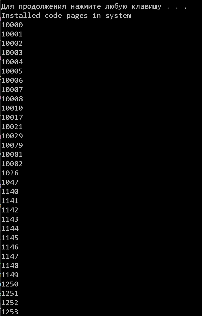 std::cout << "Installed code pages in system" << "\n";