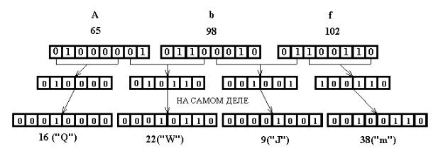 В качестве примера закодируем и раскодируем строку Abf. Приведенный ниже алгоритм не является единственно верным, это один из множества алгоритмов кодирования/декодирования base64.
