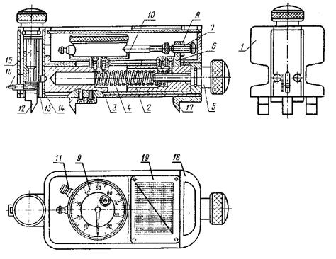 – стопорный винт, 12 – нож, 13 – шток, 14 – втулка, 15 – винт, 16 – передняя часть корпуса прибора, 17 – опорные ножи, 18 – верхняя съемная крышка прибора, 19 – шкала для пересчета