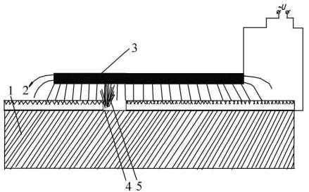 1 – стенка трубопровода, 2 - изоляционное покрытие, 3 – щуп дефектоскопа (электрод), 4 – дефект в изоляции, 5 – искровой разряд