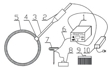 – держатель, 5 – щуп для сплошного контроля, 6 – заземлитель, 7 – штырь, 8 – магнит, 9 – щуп для локального контроля, 10 – зарядное устройство