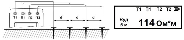 2.Установите в образцы с грунтом стальные электроды и поочередно подключите к прибору ИС-10 (измерительные гнезда Т1, П1, П2, Т2) как показано на рисунке 6.1. При этом стальные электроды необходимо установить в грунт по прямой линии через равные расстояние d, которое следует принимать не менее чем в 5 раз больше глубины погружения штырей