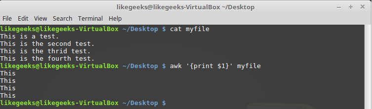 Здесь использована переменная $1, которая позволяет получить доступ к первому полю каждой строки и вывести его на экран.