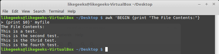 awk 'BEGIN {print "The File Contents:"}