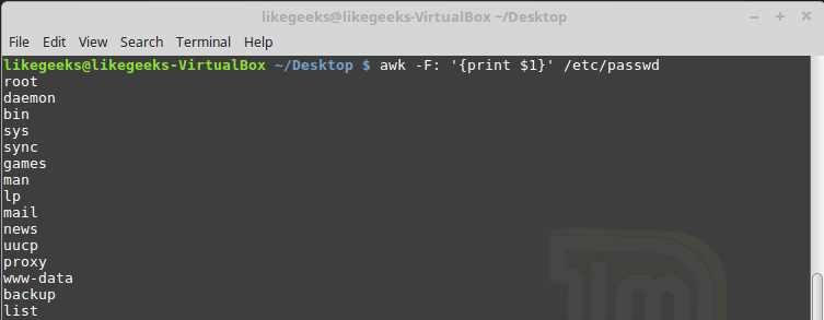 Эта команда выводит первые элементы строк, содержащихся в файле /etc/passwd. Так как в этом файле в качестве разделителей используются двоеточия, именно этот символ был передан awk после ключа -F.