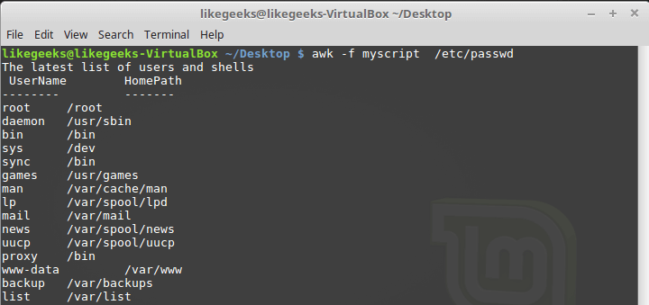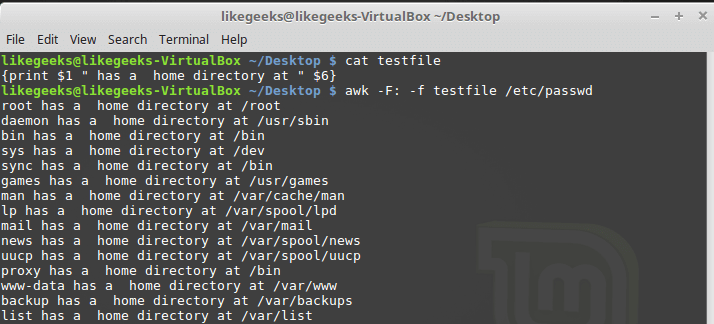 Тут мы выводим из файла /etc/passwd имена пользователей, которые попадают в переменную $1, и их домашние директории, которые попадают в $6. Обратите внимание на то, что файл скрипта задают с помощью ключа -f, а разделитель полей, двоеточие в нашем случае, с помощью ключа -F