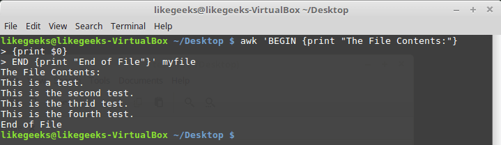 END {print "End of File"}' myfile