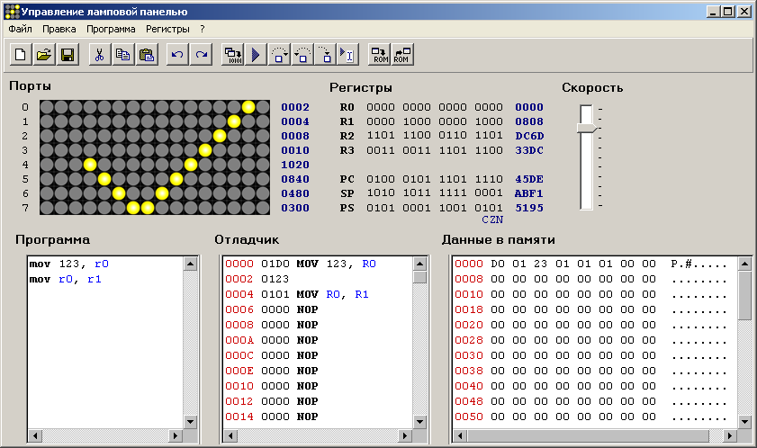 Для простейшей обработки данных можно использовать 4 регистра процессора и 8 портов ламповой панели. Основные операции: