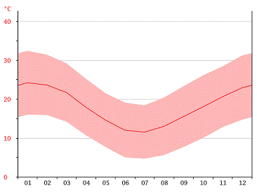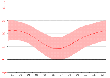 распределение среднемесячных температур в г. Блюмфонтейн. Город расположен на