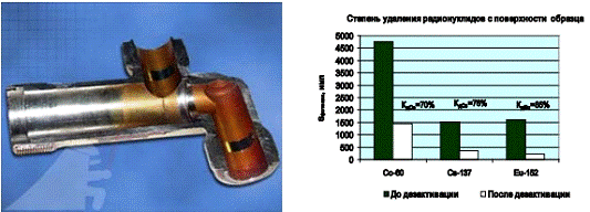 Таким образом, удаление только коррозионной пленки с поверхности металла позволяет в значительной степени снизить уровень радиоактивности последнего, обеспечив при этом возможность повторного его использования либо промышленной утилизации.
