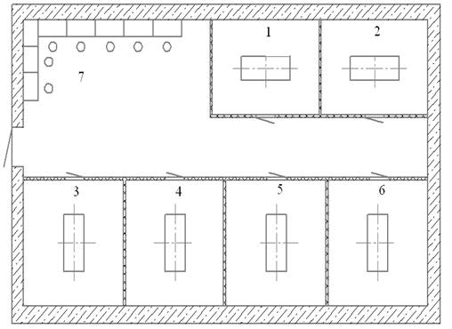 находящиеся в одном помещении, но разделенные между собой; 7 - рабочие места