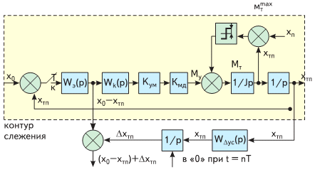 • разностная координата Х0 - ХТП, определяющая положение движущегося объекта в координатных осях ТП, определяется после экстраполятора, что позволяет учитывать движение объекта в пределах интервала дискретизации Т;