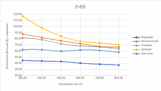 Графические зависимости интенсивности теплового излучения от расстояния для водяной завесы и экранов.