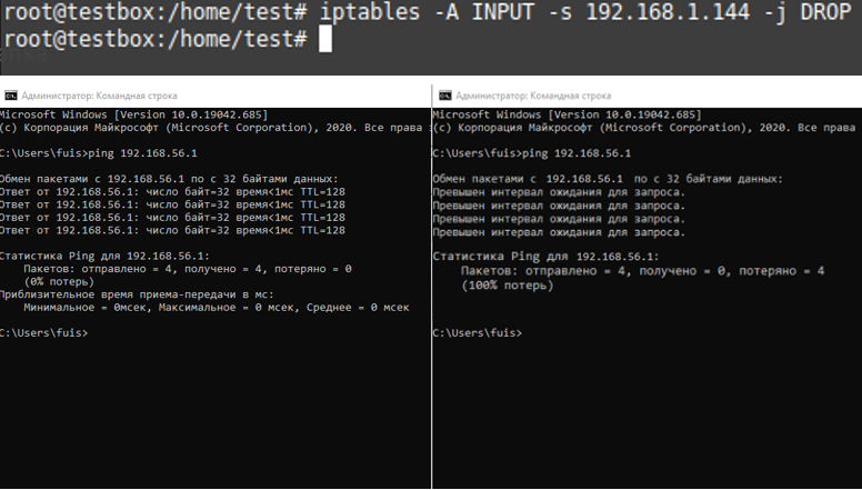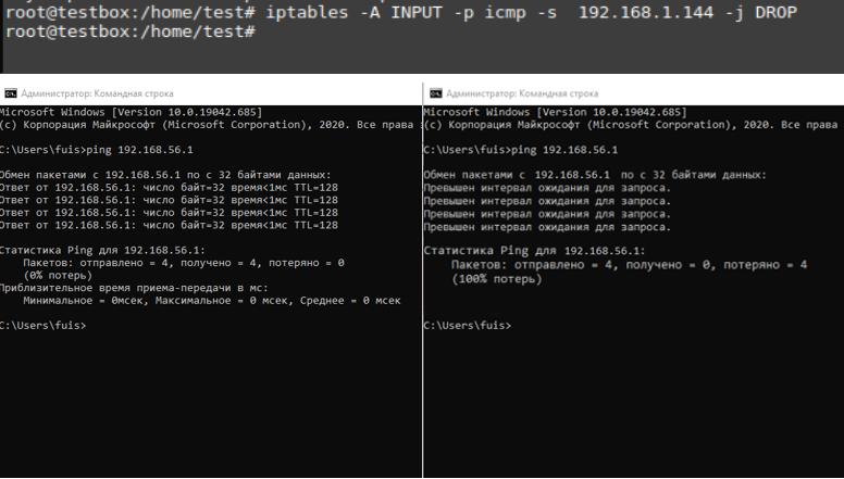 На рисунке 4 показано использование ping команды до и после блокировки INPUT icmp протокола программой iptables.