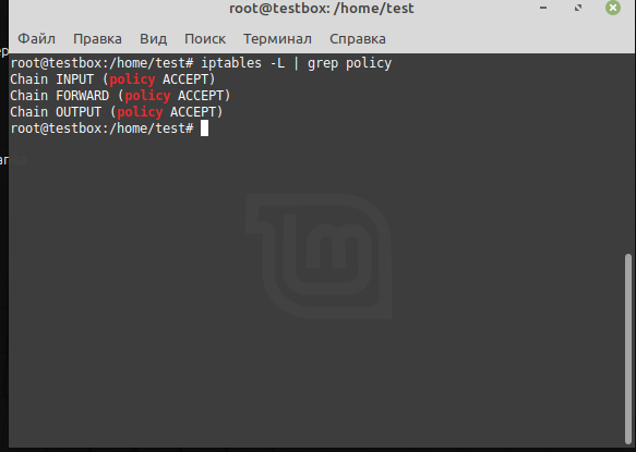 На рис. 1 показана первоначальная проверка правил iptables, при котором использовалась команда iptables -L | grep policy.