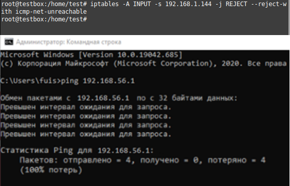 На рис. 3 показан результат блокировки. При этом действие REJECT аналогично DROP, но в отличие от DROP, команда REJECT выдает сообщение об ошибке на машину, передавший пакет.