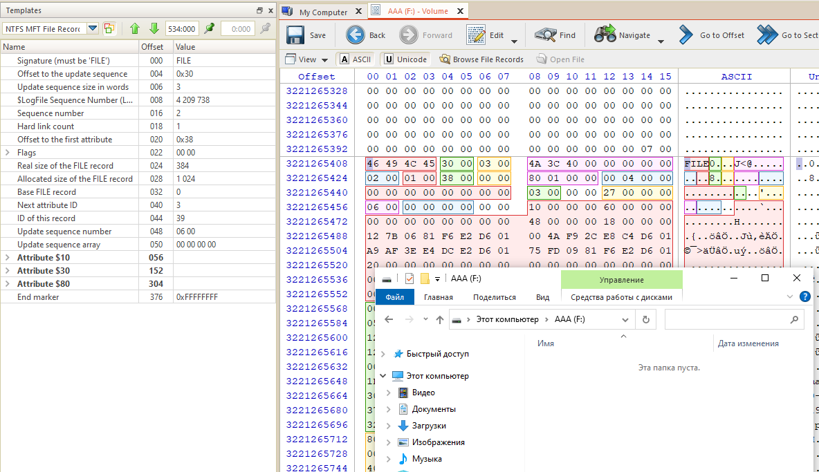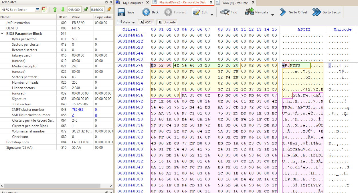 На рис. 3 показана master boot sector для флеш накопичувача. Використовуючи програму Active@DiskEditor показано, що в розділі знаходиться загальна службова інформація, що зчитується загрузці. Інформація про данні що знаходиться на носію знаходиться у таблиці MFT. MFT це база даних, у якій зберігається інформація про файли. NTFS представляє собою таблицю, рядки якої відповідають файлам.