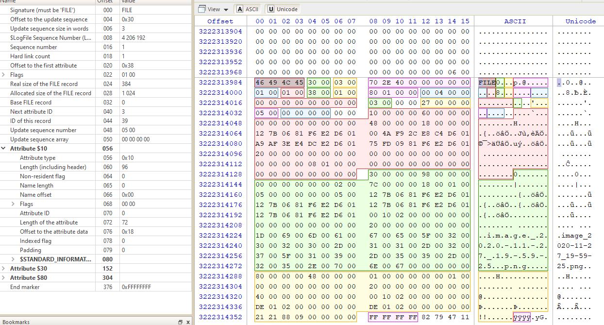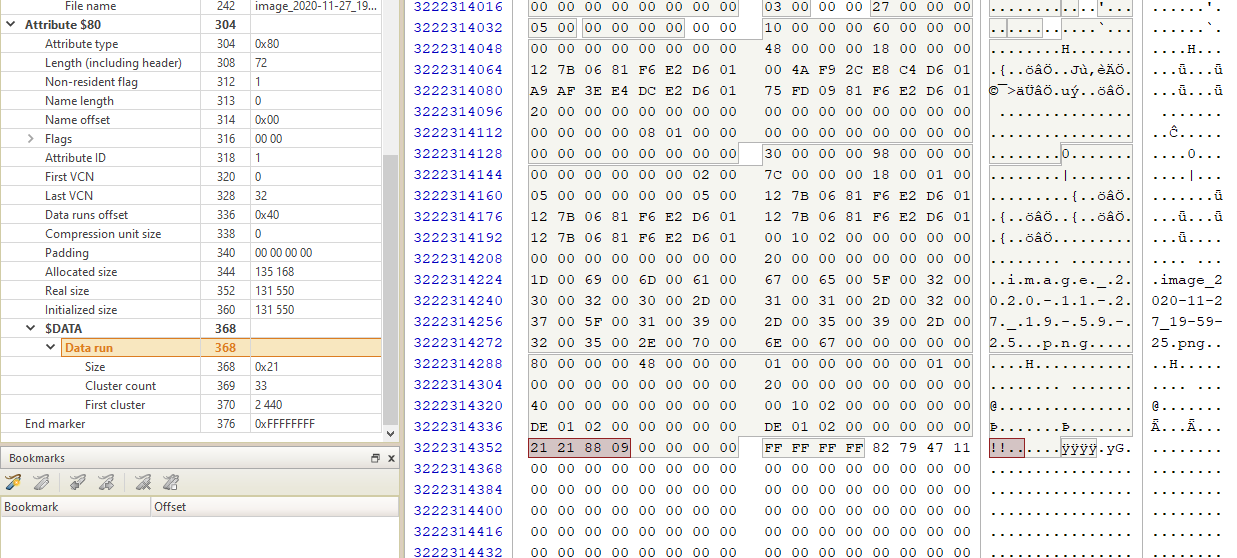 На рис. 5 показана стандартна інформація о файле (час, права доступу) – атрибут $10. Атрибут $30 показує повне ім’я файлу, він зберігає ім'я файлу у відповідній просторі імен. Атрибут $80 показує основні данні файлу. Цей атрибут сберігає інформацію про data run. Відрізком називається послідовність суміжних кластерів, що характеризується номером початкового кластера і довжиною.