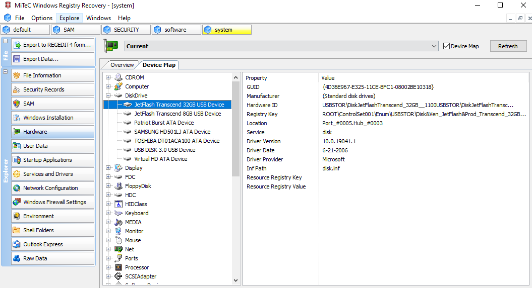 На рис. 4 показано відновлений образ реєстру за допомогою програми для перегляду та аналізу Windows Registry Recovery. На даному рисунку показна список пристроїв для збереження інформації.