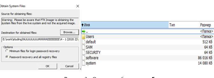 На рис. 3 показано створення копії реєстру Windows за допомогою Asses Data FTK Image. Ця програма дозволяє створювати образи які використовуються для цифрової криміналістики.