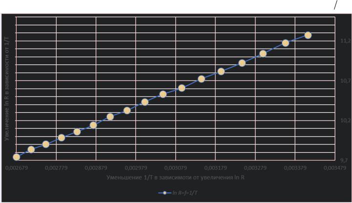 3. Строим график зависимости логарифма сопротивления от величины, обратной температуре, по таблице 2.