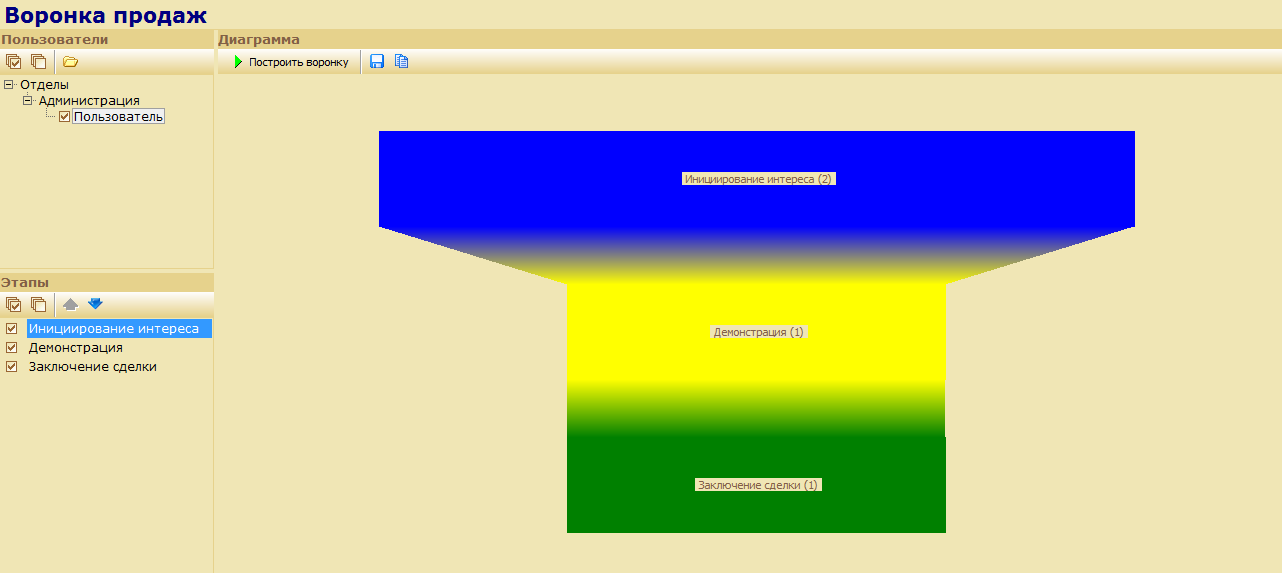 Воронка продаж – это наглядная демонстрация эффективности сотрудника предприятия. Она строится для каждого сотрудника согласно его данным о заключённых / не заключённых сделках.