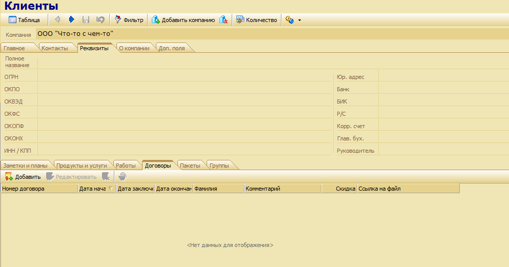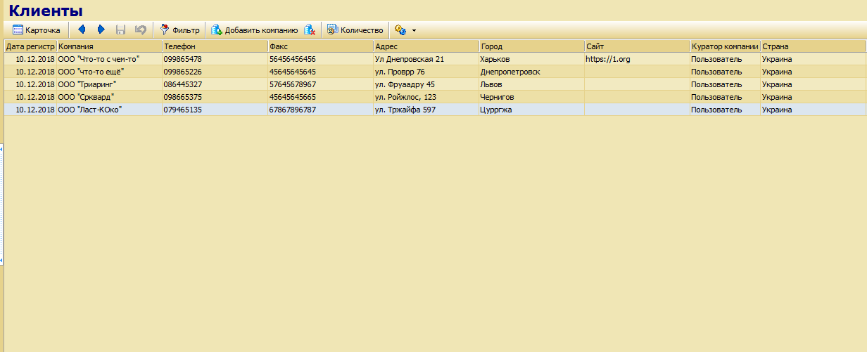 В модуле «Клиенты» создать 5-7 компаний, которые являются контрагентами компании «Рога&Копыта». Оценить внешний вид интерфейса программы при представлении информации, как в табличном виде, так и в виде «Карточки».