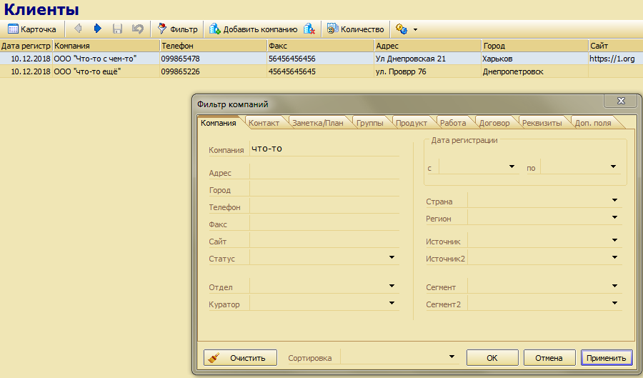 Использование фильтра оправдано при большом количестве компаний когда искать вручную не удобно, а так же позволяет найти и отредактировать информацию по компании. Из недостатков можно отметить что при закрытии окна фильтрация не отключается, нужно сначала очистить фильтр и нажать «применить».