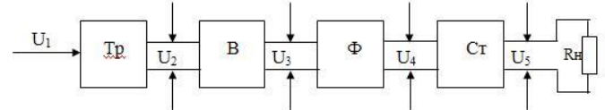 Силовой трансформатор Тр, выпрямитель В, сглаживающий фильтр Ф и стабилизатор напряжения Ст.