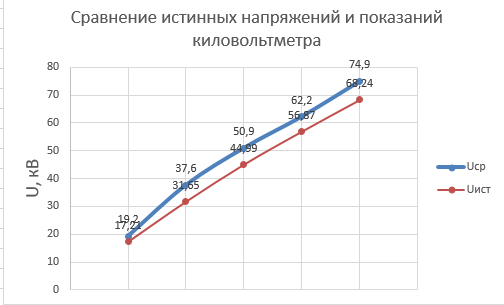 Вывод: в процессе работы были исследованы методы и устройства измерений высоких напряжений. Получили знания о принципах работы таких устройств как: шаровые измерительные разрядники, электростатические киловольтметры и делители напряжений в сочетании с низковольтными регистрирующими и измерительными приборами. Провели два опыта по калибровке киловольтметра на постоянном и переменном напряжении. Погрешность табличных и опытных значений обусловлена условиями окружающей среды (температуры воздуха и атмосферного давления), а также не идеальным оборудованием, которое вызывает некоторое отклонение результатов от идеала.
