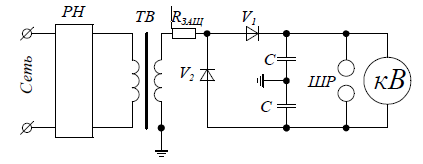 Рисунок 3 – Схема калибровки киловольтметра типа С-100 на постоянном напряжении: РН – регулятор напряжения; ТВ – трансформатор высоковольтный; Rзащ –защитный резистор; V1, V2 –вентили; C – конденсатор; ШР – шаровой разрядник; кВ – киловольтметр