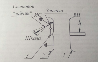 Рисунок 5 – Схема устройства электростатического киловольтметра: 1 – высоковольтный электрод; 2 – заземленный электрод-экран; 3 – подвижный электрод; ИС – источник света