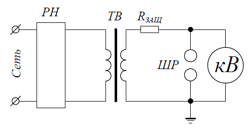 Рисунок 1 – Схема калибровки киловольтметра типа С-100 на переменном напряжении: РН – регулятор напряжения; ТВ – трансформатор высоковольтный, Rзащ – защитный резистор; ШР – шаровой разрядник; кВ – киловольтметр
