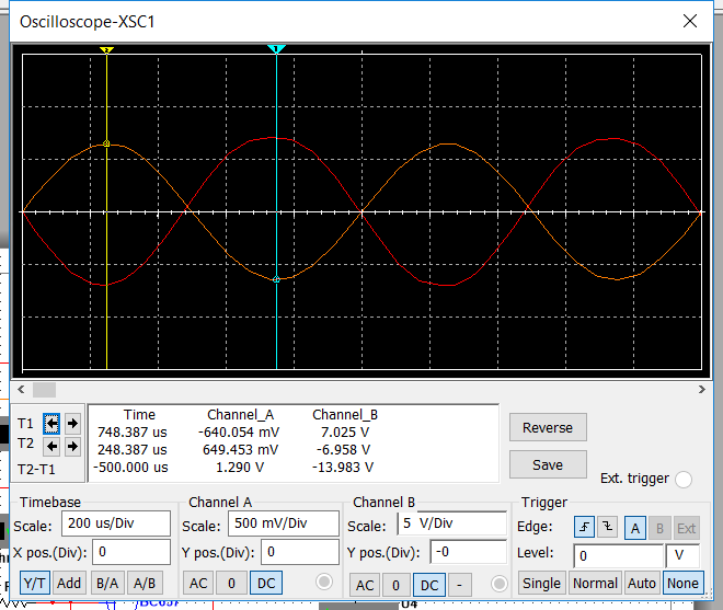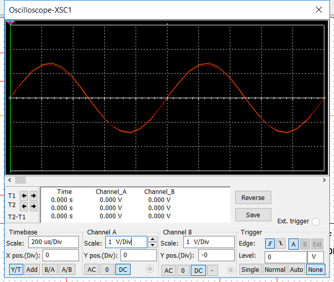 Подаем на вход усилителя синусоидальное напряжение и, регулируя его амплитуду, устанавливаем на входе максимальный сигнал, соответствующий неискажённому напряжению на выходе. Регулирование входного напряжения осуществляется с помощью генератора входного сигнала XFG1. Осциллограмма приведена на рис.2.