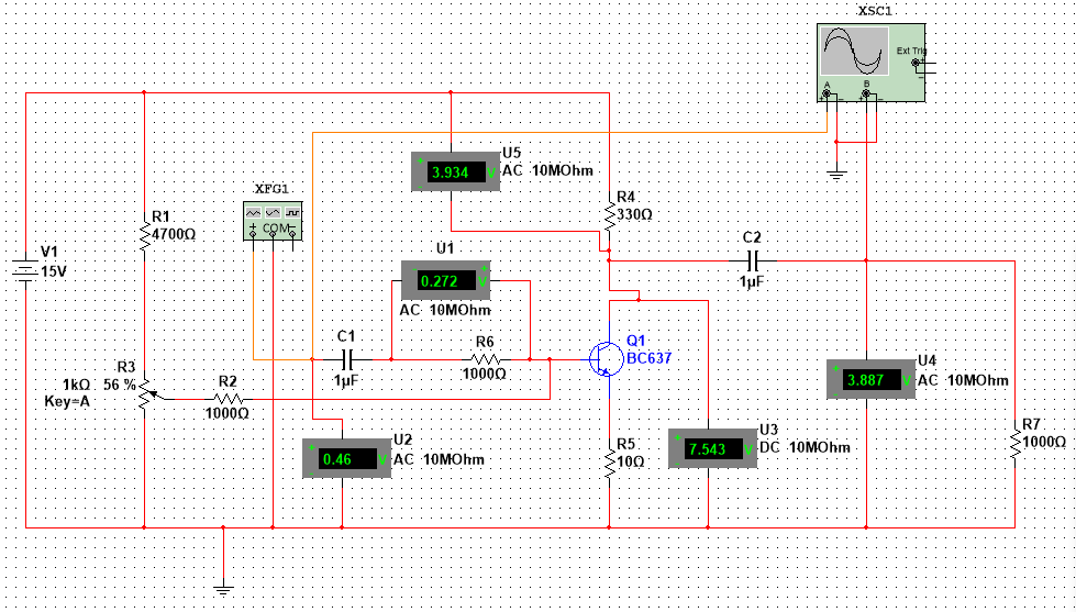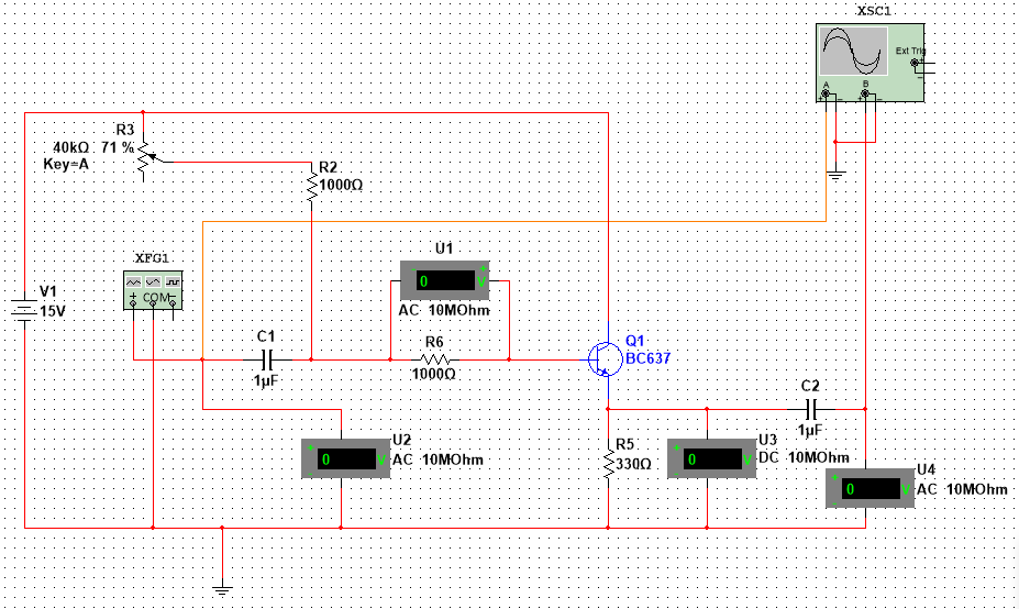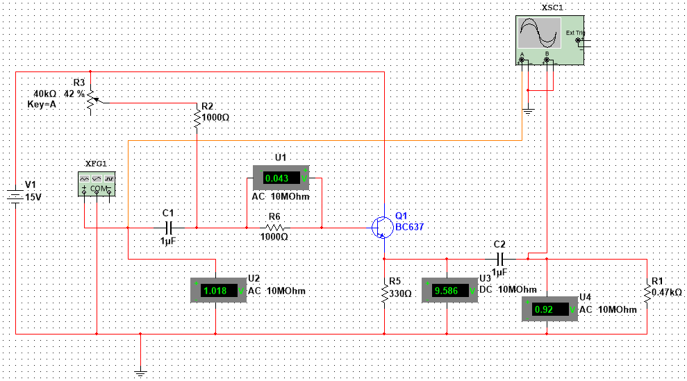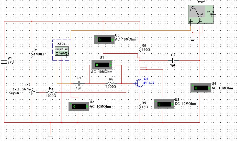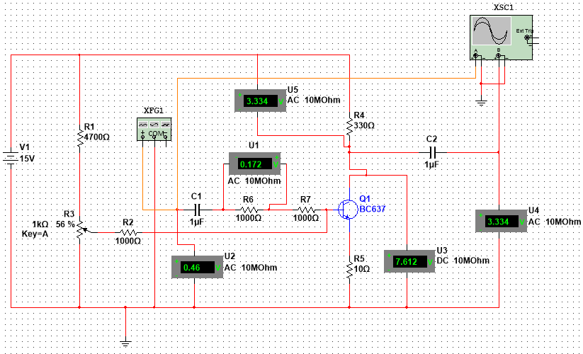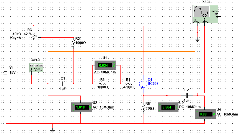 Собираем цепь согласно рис. 1. В ней напряжение смещения регулируется потенциометром 1 кОм. Последовательно с источником переменного сигнала и на выходе включены конденсаторы 1 мкФ для развязки цепей постоянного и переменного тока. На входе имеется также токоограничивающее сопротивление 1 кОм. Для стабилизации характеристик транзистора включено сопротивление 10 Ом в цепь эмиттера.