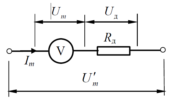 Для изменения предела измерения вольтметра последовательно с ним включают добавочное сопротивление Rд. При этом измеряемое напряжение U'm равно: