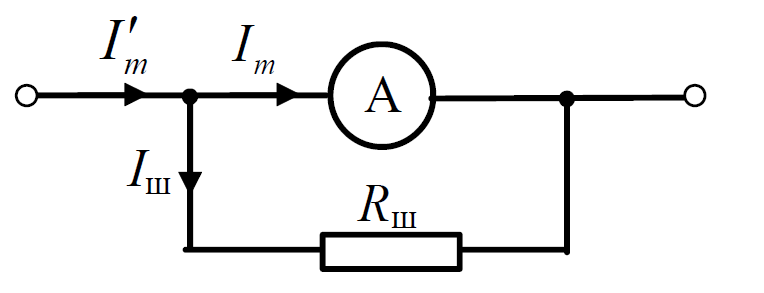 Шунтирование – подключение параллельно амперметру с внутренним сопротивлением RA сопротивления Rш, называемого шунтом. Схема подключения приведена на рисунке 1. При этом часть тока Iш проходит через шунт, а общий измеряемый ток I'm становится больше, чем предел измерения амперметра I'm. Такое соединение можно рассматривать как амперметр с новым пределом измерения, равным I'm.