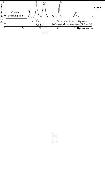 Хроматограмма афлатоксинов в молоке. Регистрация с помощью флуориметрического детектора (возбуждающая длина волны 365 нм; возбужденная — 455 нм)