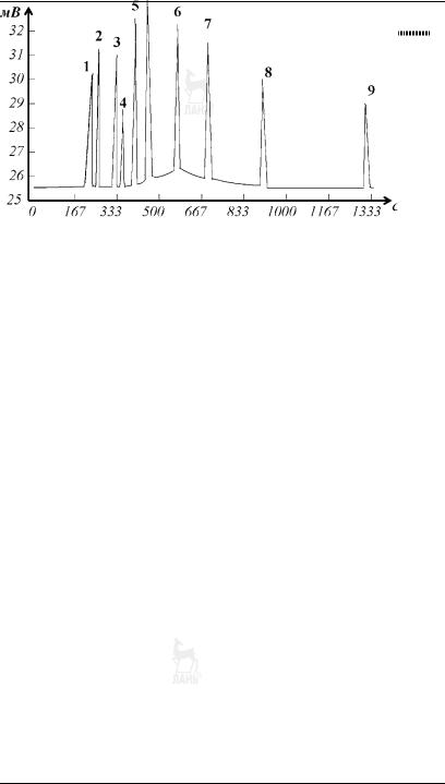 В настоящее время методики с использованием ГЖХ стандартизированы и широко используются для контро ля безопасности при подтверждении соответствия воды (содержание хлорорганических пестицидов), водок и эти лового спирта (содержание токсичных микропримесей) и др. На рисунке 6.14 представлена хроматограмма мик ропримесей водки, из которой видно, что методом ГЖХ с использованием капиллярной колонки возможно раздель ное определение всех микропримесей.