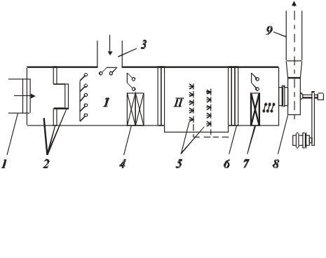1 – заборный воздуховод; 2 – фильтр; 3 – соединительный воздуховод; 4 – калорифер; 5 – форсунки увлажнителя воздуха; 6 – каплеуловитель; 7 – калорифер второй ступени; 8 – вентилятор; 9 – отводной воздуховод