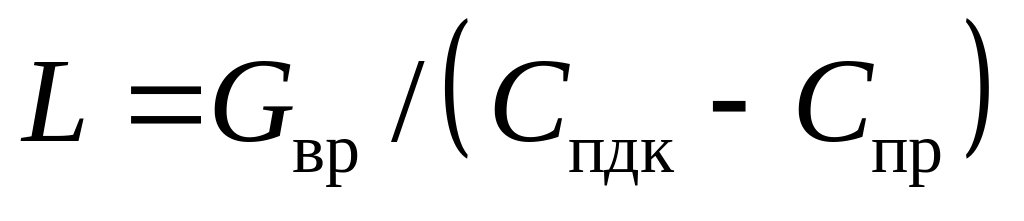где Gвр - интенсивность образования вредностей мг/ч, Cпдк, Спр - концентрация вредностей в пределах ПДК и в приточном воздухе.