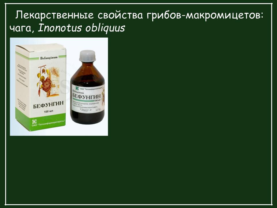 Препарат из чаги Бефунгин применяется в качестве симптоматического средства при заболеваниях желудочно-кишечного тракта (хронический гастрит с усиленным выделением желудочного сока, язвенная болезнь желудка и т.п.), а также нашел широкое применение при онкологических заболеваниях.